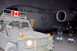 A military vehicle from Canada passes a C-17 Globemaster III from March Air Reserve Base on the ramp at the airport in Port-au-Prince, Haiti, Jan. 22. The C-17 transported 15 Airmen from the 67th Aerial Port Squadron at Hill Air Force Base, who, expect to be deployed for at least 45 days to
