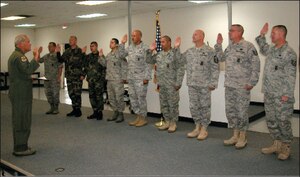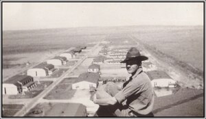 An Army Air Service soldier gets a bird's eye view of March Field from atop the original water tower, sometime between the summer of 1918 and 1922. The view is to the west, along what is now B Street. The hangars and the flight line lie to the south. The original flight line ran east to west on the