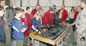The 452nd Security Forces Airmen brief Boy Scout Troop 270, from Riverside, Calif., on military weapons used in the line of duty. The hands-on demonstration and briefing was part of a March Air Reserve Base Tour provided to Troop 270 on Sat., Jan. 21, which also included C-17 and KC-135 static