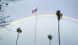 A rainbow arcs over the flagpole and palm trees in front of the wing headquarters building late December, 2010. Senior base meteorologist Mark Ditter said December was a record breaking month. "That was our rainiest December on record on the base, ever," he said. Previously, the record had been 6.1