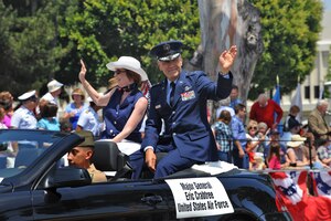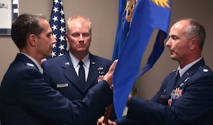 Col. Jeffrey Pennington, 452nd Operations Group commander, hands the flag of command to Lt. Col. Mark Davis in a change of command ceremony at March Air Reserve Base. Colonel Davis took command of the 729th Airlift Squadron from Lt. Col. Michael Hames.