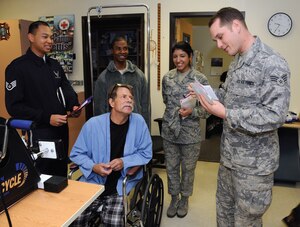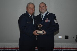 Mrs. Beth Crabtree (right) and Chief of the Air Force Reserve, Lt. Gen. Charles E. Stenner, Jr. (left), pin second stars on the shoulders of Fourth Air Force commander, Maj. Gen. Eric W. Crabtree, at General Crabtree's pinning ceremony at the Cultural Resources Center on base.
