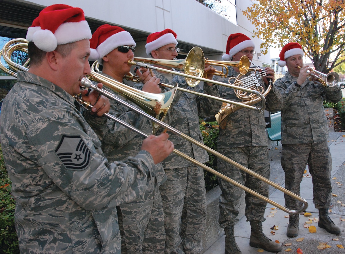 Happy Holidays, Team March! Published Dec. 21, 2009 By 452 AMW 452 AMW MARCH AIR RESERVE BASE, CALIF. -- The Air Force Band of the Golden West warms up for their final caroling performance of the day.