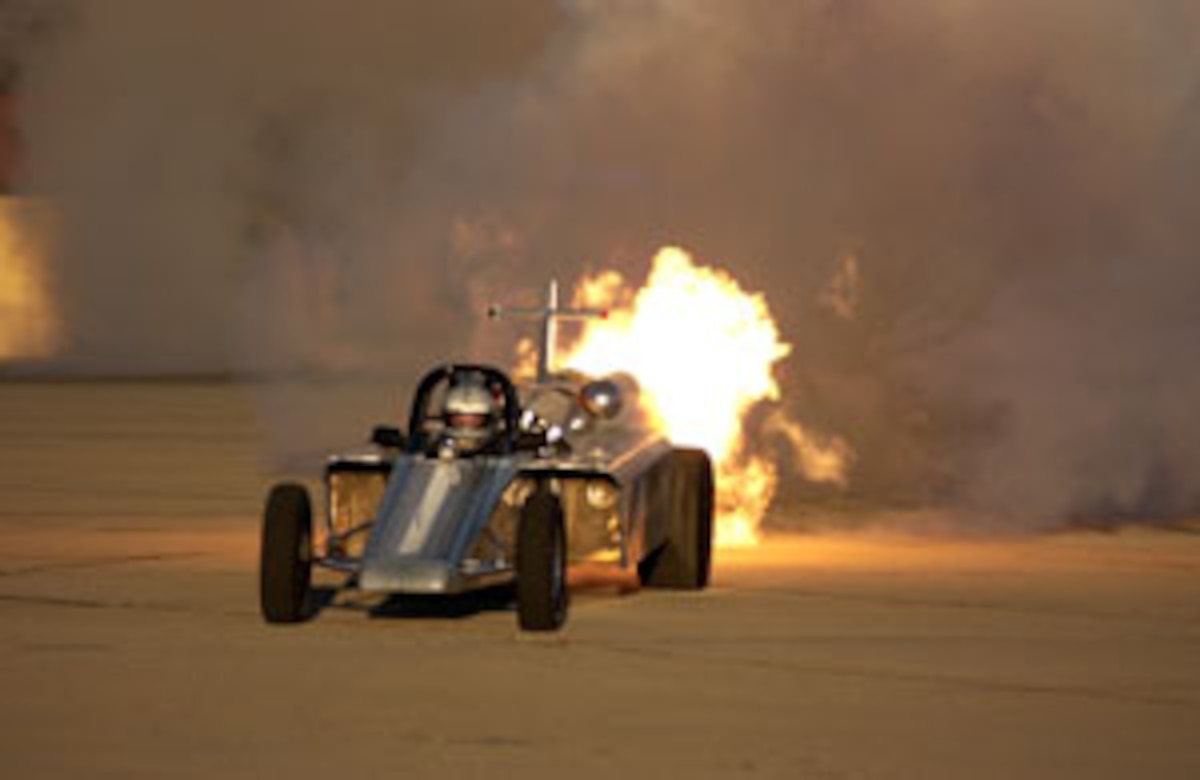 Where there is smoke, there is fire Published March 19, 2007 By Staff Sgt. Amy Abbott 452 AMW/PA MARCH AIR RESERVE BASE, Calif. -- It's loud, very loud. But even more impressive than the thunderous roar it liberates from its 10,000 horsepower engine, is the other facet it's known for - its speed. Fast just isn't descriptive enough. The Air Force Reserve Jet Car, which can accelerate from zero to 400 mph in eight seconds, took its first test drive of the season last week at March. Revving up the engine and spewing fire down the flight line, driver Bill Braack and his team tested the speeding bullet on wheels before starting this year's season of touring. The jet car is used as a promotional tool for the Air Force Reserve and many of the stops this year will be at air shows on the East Coast, starting with Georgia. As Mr. Braack, a retired Air Force Reservist, explained the car goes wherever the Air Force needs it. At the air shows where it is featured, it gives a spectacular performance of sheer speed and skill. Car and driver wait on the open tarmac as a designated aircraft approaches at a low altitude overhead. As soon as the plane passes the car, Mr. Braack lets loose his speed demon and races it down the runway 2,000 feet, leaving behind a thick cloud of smoke, a wild display of crimson flames and, typically, the aircraft that dared to test it. Applying the philosophy, if you feed them they will come, this year Air Force Reserve Command has also decided to add a bonus feature to the performance. While the jet car sits for viewing by the public at the various upcoming air shows, celebrated Chef Marc will be at the vehicle cooking up delectable treats and attracting attention with his aromatic presence. Combining an extreme speed-mobile with a world renowned chef will offer more than just "fast" food, but an opportunity to spread the word about the world's greatest Air Force and the continuous mission its reservists are supporting around the globe. In addition to giving the car a test run, while the team was at March they also shot some film for an upcoming segment on the food channel as well as for Air Force Reserve promotional pieces.